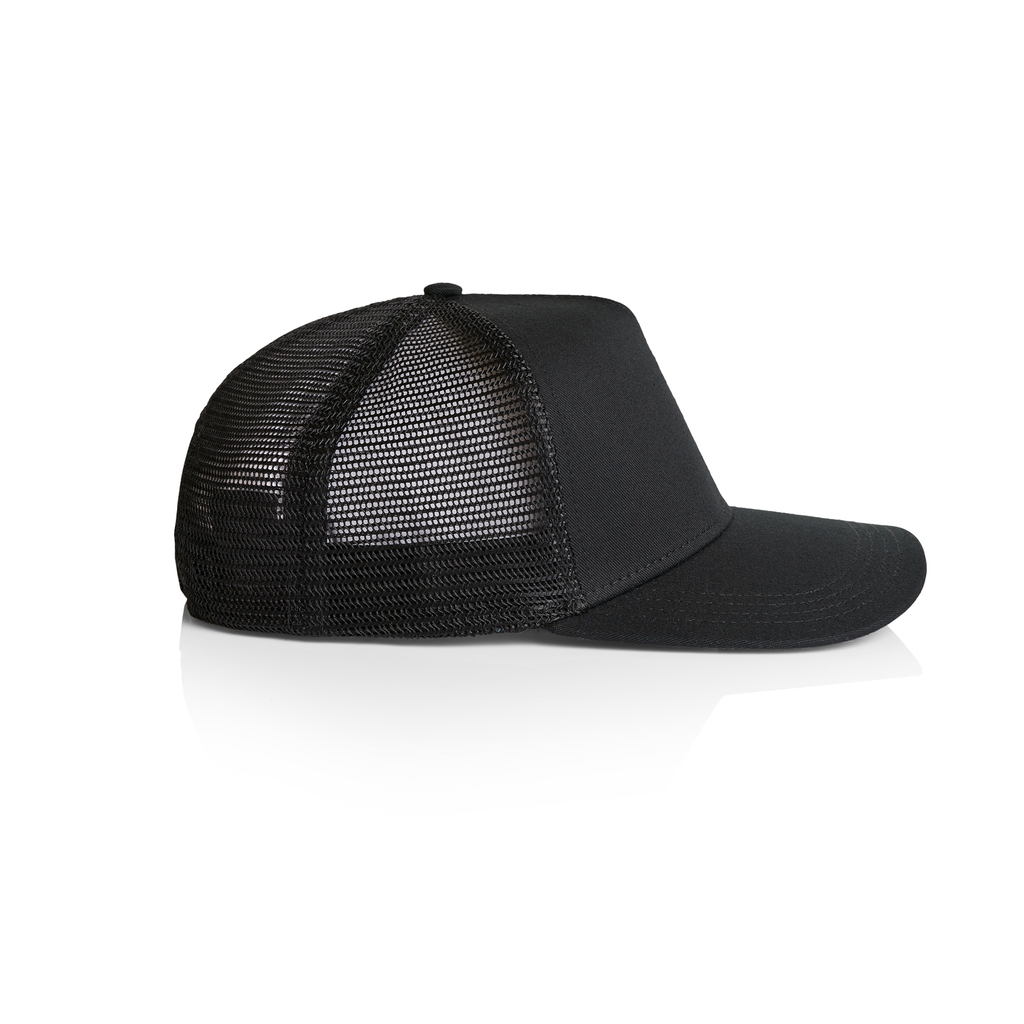 Classic American Indie keep cool with mesh side and back panels. Pre-curved peak. Padded cotton sweatband. Adjustable plastic tab at rear. 5 panels. Padded polyester front panel with nylon mesh side and back panels