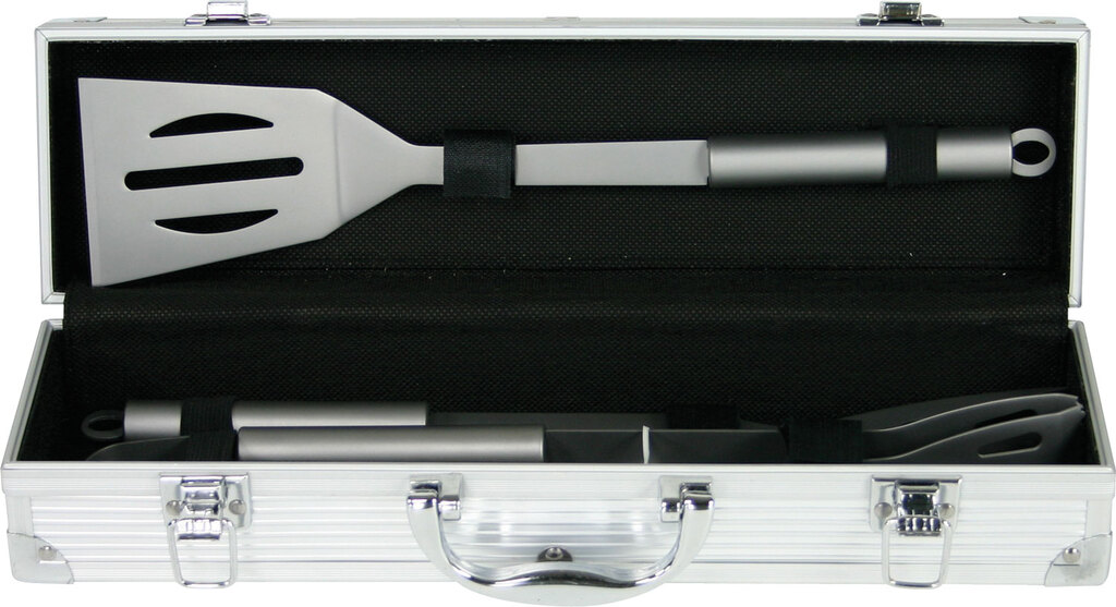 This elegant Henley BBQ tool set is made of solid stainless steel with natural painted bamboo handles, sitting in a black molded foam and packed into a solid natural painted bamboo latch closure carry case with a silver handle. The BBQ tools are made of professional quality 420 stainless steel, making this grill set durable, long lasting, and easy to clean. This Henley BBQ set contains essential BBQ tools of spatula, tongs, and a fork. A high quality premium corporate gift for presenting your logo.