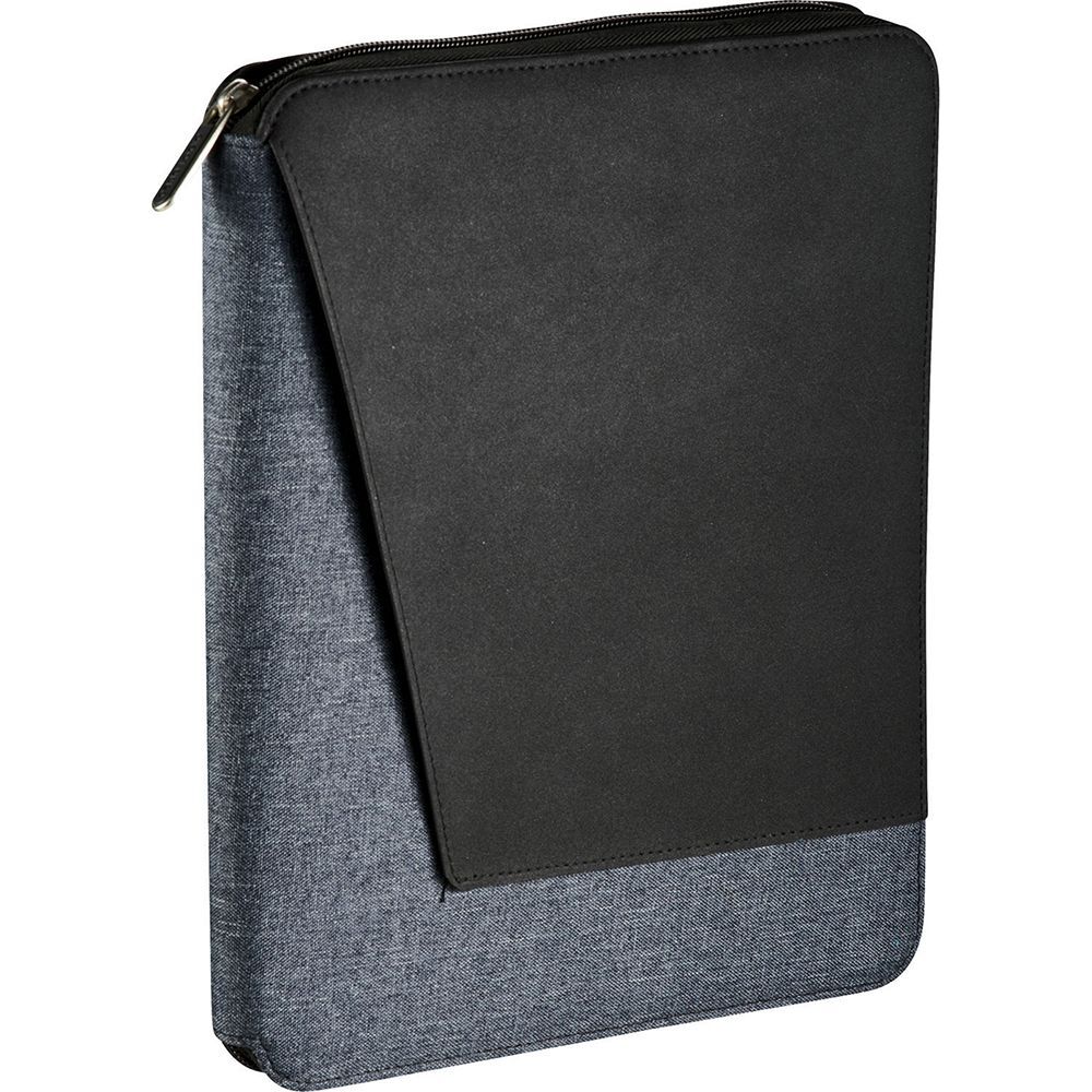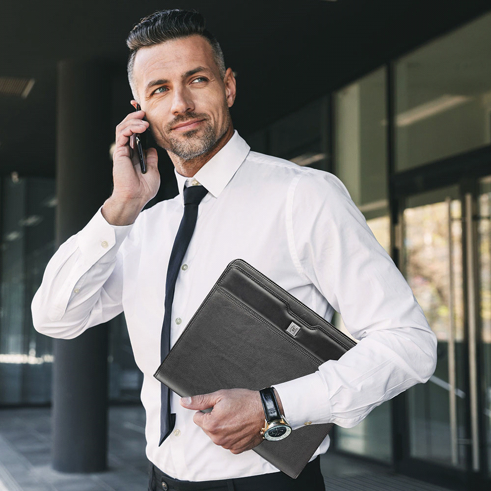 Durable PU leather portfolio with a tan strip and a zippered closure. It includes an A4 lined pad, a phone stand, a double strap holder, two single strap holders, a pen holder, and six business card holders.